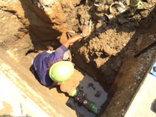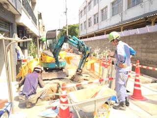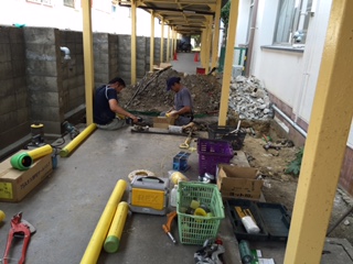 教室のエアコンは、ガスヒーポンなので、ガス配管の工事をしています。学校の外も中も掘り起こしてガス配管の分岐やメーターボックスの設置など、暑い中での作業をありがとうございます。