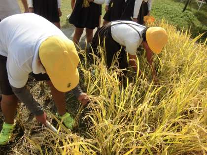 ひとりひとり鎌を持って刈りました。ほとんどの子が初めての経験でしたが、苦労しながらも安全に行うことができました。都会ではなかなか経験できない貴重な体験をすることができました。