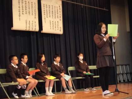 校長先生の話のあと、1年生から6年生の代表の子どもが2学期の思い出を発表しました。「運動会楽しかった。」「九九マスターになったよ。」「大縄跳べるようになった。」など、一人一人の頑張ったようすが伝わってきました。