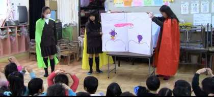 1月20日、委員会の時間に健康委員会の子どもたちが東生野保育所へ行って、以前児童集会で発表した「かみかみHAPPY しっかりかむでえ」を見せました。