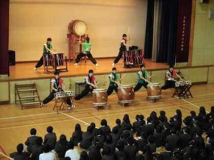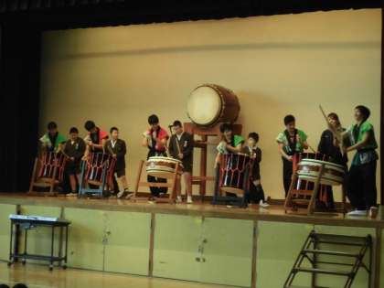 そしてその後は、金光藤蔭和太鼓部のみなさんによる演奏を保護者や地域のみなさんと一緒に楽しみました。いろんな大きさ・形の太鼓の音が響き合って、講堂が震えるぐらいの迫力です。みんなの息もぴったりで、振り付けもピシピシッと決まっていてとってもかっこよかったです。後半には子どもたちに太鼓をたたかせてもらえるコーナーもあり、子どもたちは最初から最後まで演奏に引き込まれていました。驚いたのは、演奏内容はもとより、高校生の規律の正しさです。朝早くの準備から後片付けまで、てきぱきと動き、はきはきとあいさつをしていました。日ごろからの行いがメリハリのきいた演奏につながるのだなあと感じました。