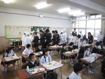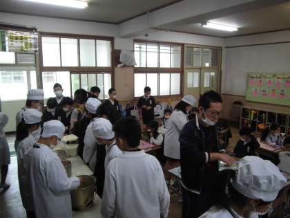 1年生の給食は6年生が準備を手伝ってくれます。