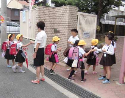 子どもたちも そんな 明るい声に答えて 相手の顔を見て 元気よく あいさつ しています。