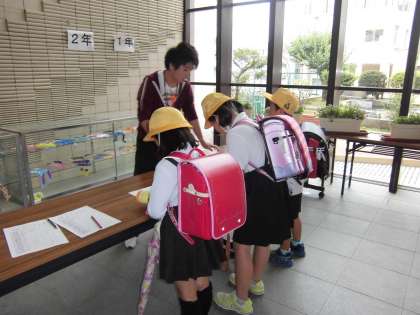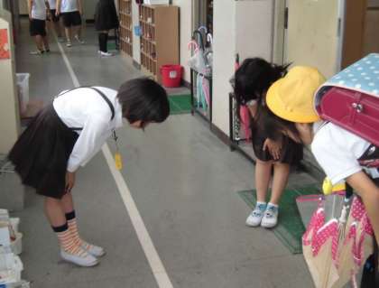 教室の前では 各クラスの学級代表が 元気なあいさつで みんなをむかえています。