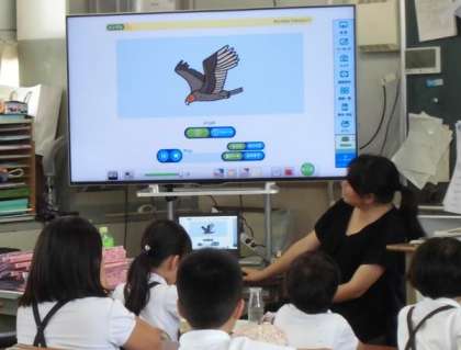 これは、みんなで アルファベットの歌に合わせて 発音の勉強をしている様子です。
