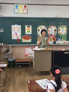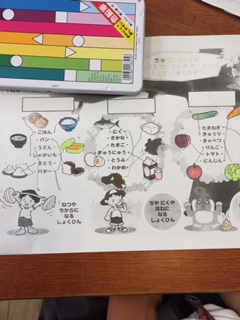 14日木曜日、1年生は初めての栄養指導がありました。北巽小学校の栄養士の先生と、三色栄養(赤、黄、緑)について勉強しました。子ども達は、昨日の献立の食材は何色かを一生懸命考えていました。