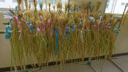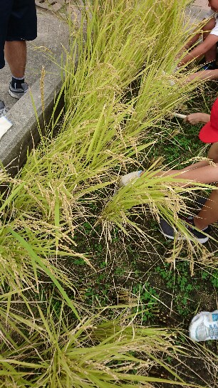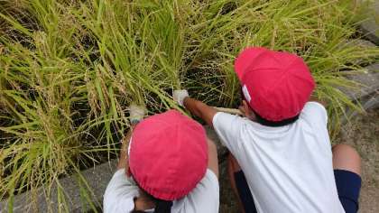 6月に田植えした稲がついに収穫の時を迎えました。初めて使う鎌に戸惑いながらも、たくさん収穫できました。収穫した稲は教室の前で干しています。11月には脱穀を行います。