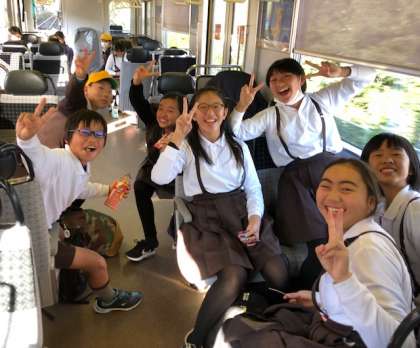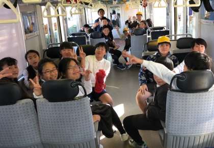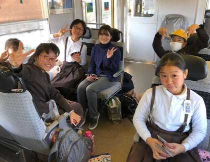 お菓子を食べたり、カードゲームをしたりしながら電車での旅を楽しんでいます。