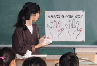 朝の清潔検査の時間に 各学級で健康委員が 手あらい実験をしました。