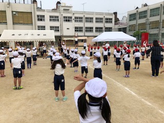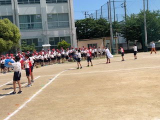 とてもいい天気の中、運動会の全体練習が実施されました。2回目なので入場行進も上手になりました。応援団もとてもよく頑張っていました。本番、楽しみにしていてください。