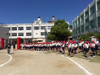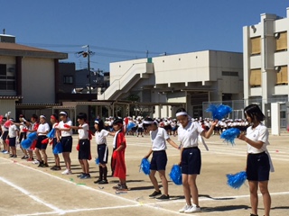 全体練習で応援団と全校児童が応援練習をしました。大きな声で頑張っています。かっこいいです。