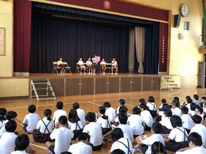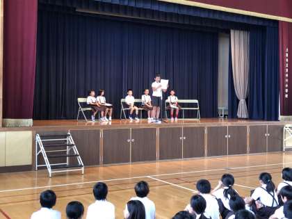 明日から夏休みです。終業式では子どもたちが、頑張ったことや楽しかったことなどについて1学期の思い出を発表しました。