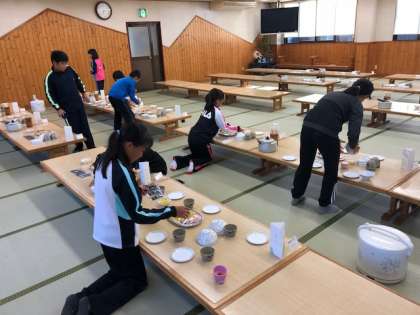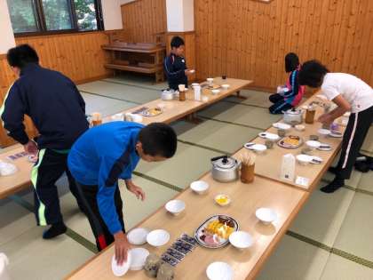 食事係の子ども達は、みんなが集まる15分前に食堂に集合し、配膳をしてくれます。