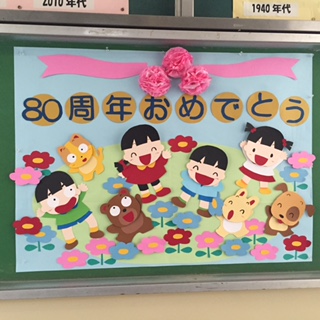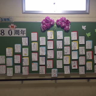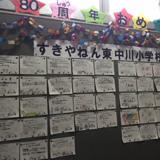 校内の掲示板に、お祝いメッセージがいっぱいです。