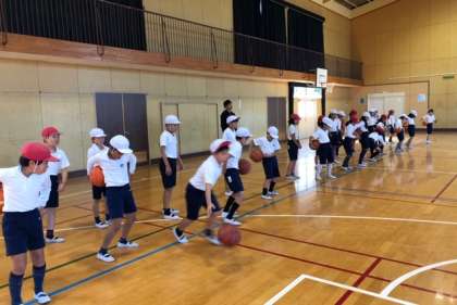 今日はプロバスケットボールチームのエヴェッサ大阪からコーチが3,4年生に来てくれました。子どもたちはドリブルやシュートのコツを教えてもらいながら、とても楽しく活動していました。最後はコーチ2人対子どもたち6人が試合をしました。コーチチームの素早いドリブルやパス、ダンクシュートなどさすがのプレーに子どもたちからは大きな声援があがりました。