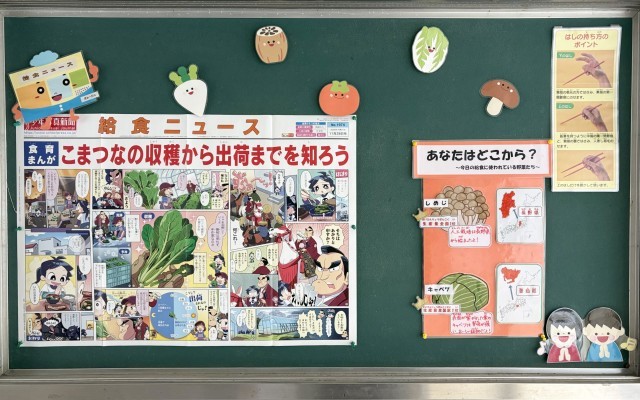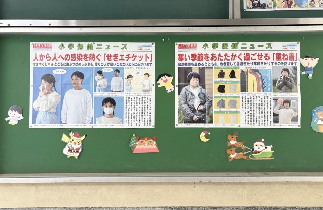 保健室前の廊下には、「保健」や「給食」に関するニュースが掲示さてれいます。
