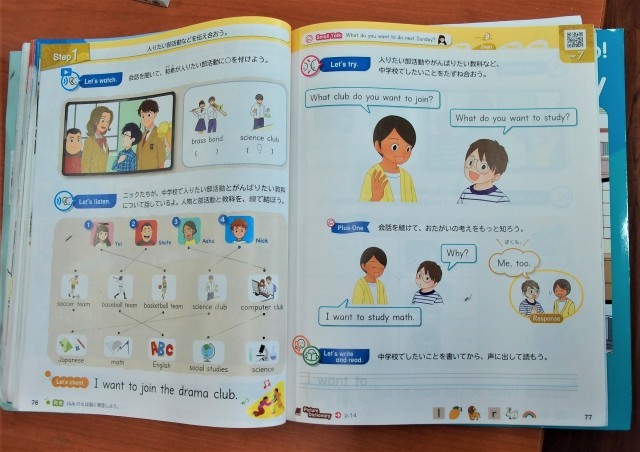 「中学校で入りたい部活動」や「頑張りたい教科」について紹介している会話を聞いて、
