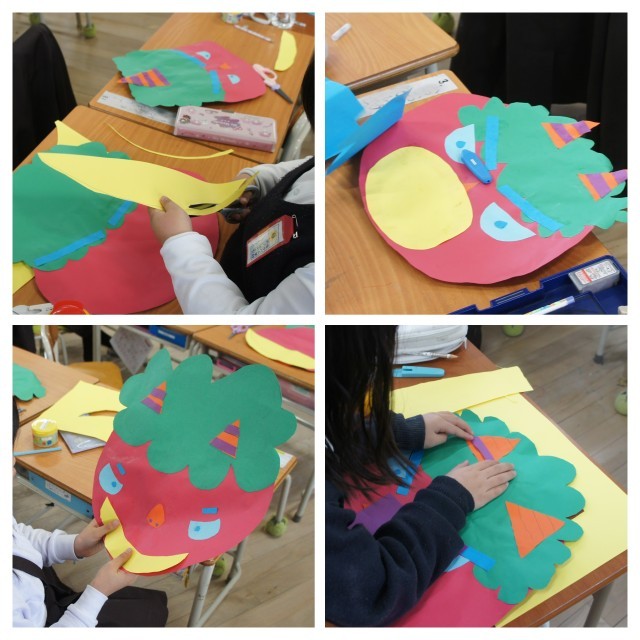 今日は、鬼の顔をパーツごとに切り貼りして、版を作りました。