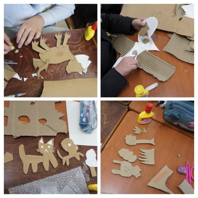 ダンボールを型通りに切ったり、貼ったりして、版を作っていきました。