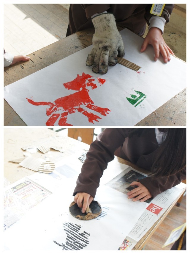 材料や版や色を組み合わせて、うつすことを楽しんでいました。
