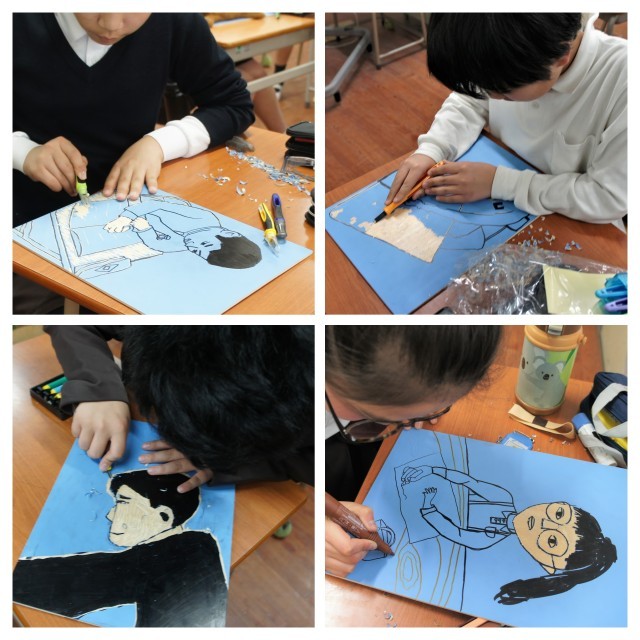 自分の授業の風景を版木に描けたら、彫刻刀で彫っていっています。