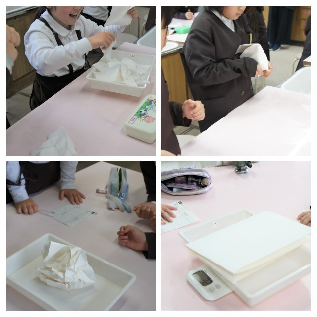 今日は「形を変えると重さは変わるのか」ねん土と画用紙を使って実験しました。