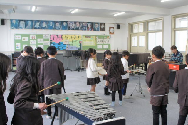 今日は鉄琴、タンバリン、トライアングルなどを使って、みんなの音楽時計の音を作りました。