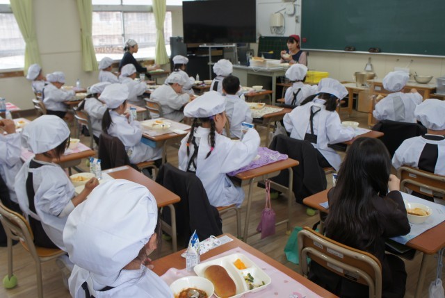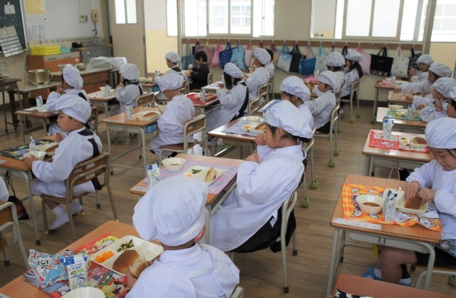 1年生は初めての給食にドキトキ。
