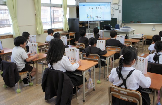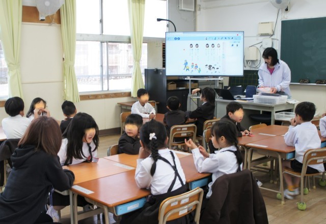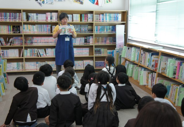 1組さんは、図書室へ行き、学校司書の先生に読み聞かせをしてもらっています。