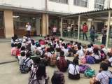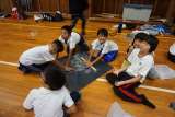 朝の集いが終わり、カートンドック作りです。 あいにくの雨なので、食堂で準備をして...