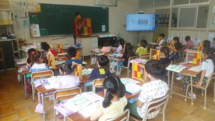 今日の1年生の授業は百玉そろばんを使って実際に数えながら考えました。