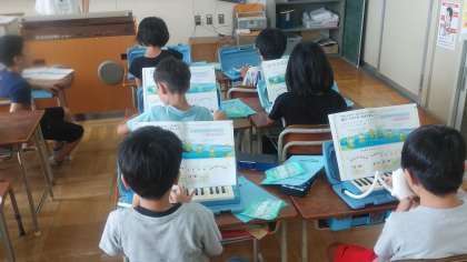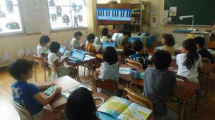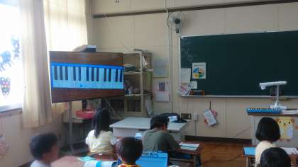 書画カメラを使って鍵盤を大型モニタに映し出して鍵盤ハーモニカの練習