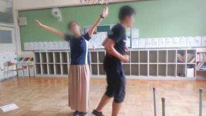 暑さ厳しい中、1年1組の教室から音楽と先生たちの声が…