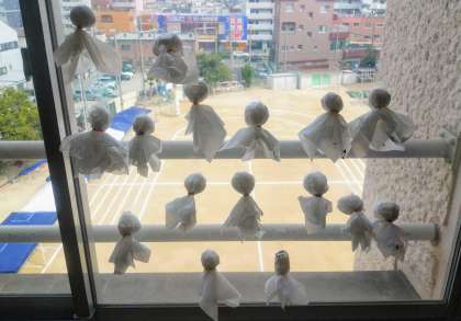 「絶対に日曜日にしたい。」という気持ちのこもったたくさんの「てるてる坊主」が6年1組の窓から校庭を眺めています。