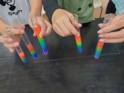 食塩の濃度を変えて、試験管に虹をつくりました。