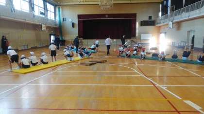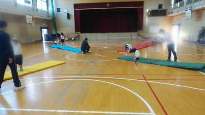 「ゆりかご」などマット運動につながる動きを使った予備運動から「前転」「後転」へ