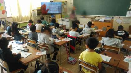 子どもたちは、黒板に書かれた文字だけでなく、自分たちと同じノートに書き込む先生の様子を大型モニタで見ながらノートに書き込みます。