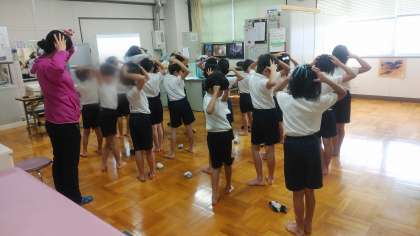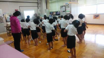 体重測定の後、養護教諭より姿勢をよくする体操について教えていただきました。