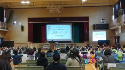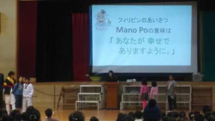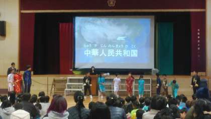 「あいさつ」をテーマとして小路小学校に通う子どもたちのルーツのある国についてスライドで学びクイズを出しました。