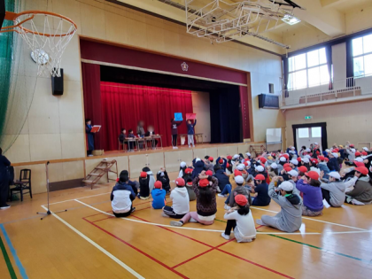 給食委員の児童の考えた寸劇を見て、その最後に○??クイズに答える、というもの。みんな、集中して劇を見たり、芝居や小道具で笑ったり、盛り上がっていました。