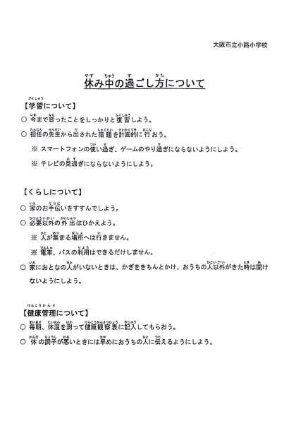 ご家庭におかれましてもご一読の上、もう一度休業中のくらしについてお子様とご確認ください。