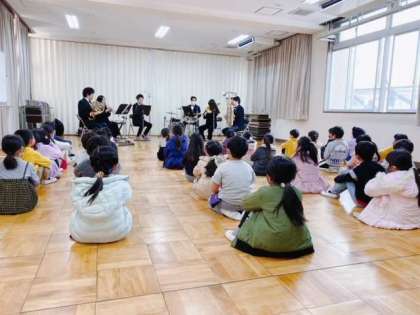 1・2年生の音楽鑑賞も、子ども達は大喜び!金管・打楽器で奏でられる軽快な音楽に、子ども達は驚きや感動を隠しきれない様子で、思わず「わぁぁ!」と言った子もいました。『アフリカン・シンフォニー』や『スーパーカリフラジリスティックエクスピアリドーシャス』『歌えバンバン』など、子ども達が音楽発表会で演奏した曲や校歌も演奏してくださり、音楽や楽器をより身近に感じることのできるいい体験ができました。