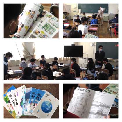 2〜6年生は、新しい学級教室に入り、学級目標の設定、自己紹介などの学級びらきの活動をしました。プリントや教科書など、たくさんの配布物を配っています。教科書は乱丁等がないかの確認をご家庭でもお願いします。