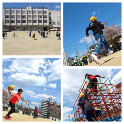 ポカポカ陽気に包まれ、運動場は元気よく遊ぶ子どもたちでいっぱいです。体を動かして遊ぶことが好きな子どもたちがたくさんいる学校です。
