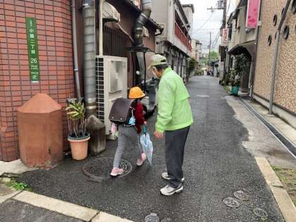 子どもたちの登校時は、地域の方々が安全に登校できるようにボランティアで見守ってくださっています。蛍光色のウインドブレーカーを着て交差点に立ち、子どもたちに声をかけてくださったり、横断の誘導をしてくださったりしています。