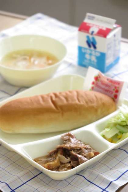今日の献立は、【豚肉のデミグラスソース・スープ・キャベツとコーンのソテー・いちごジャム・コッペパン・牛乳】です。