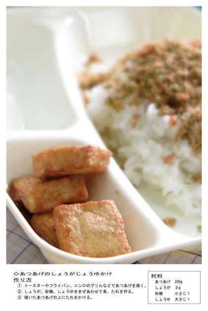 【あつあげのしょうゆだれかけ】は子どもたちに人気のメニューです。給食では、生姜入りの【あつあげのしょうがじょうゆかけ】というメニューも提供されます。