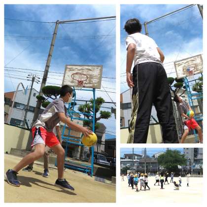 高学年は、バスケットボール・バレーボール・キャッチボールなど、ボールを使ってよく遊んでいます。低学年は、おにごっこなど、元気いっぱいに運動場を走り回っています。