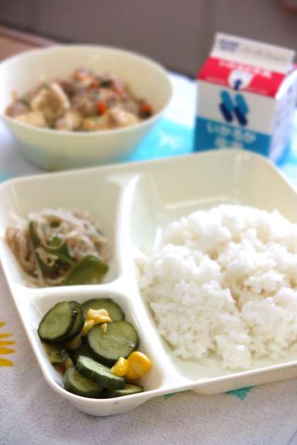 今日の献立は【マーボーどうふ・きゅうりとコーンの甘酢あえ・もやしとピーマンのごまいため・ごはん・牛乳】です。