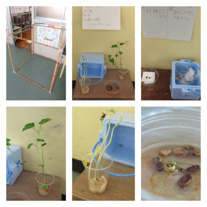 ひとつは、【1立方メートルがどのくらいの[かさ]かを知るため】の展示。もうひとつは、理科の【発芽の観察のため】の展示です。